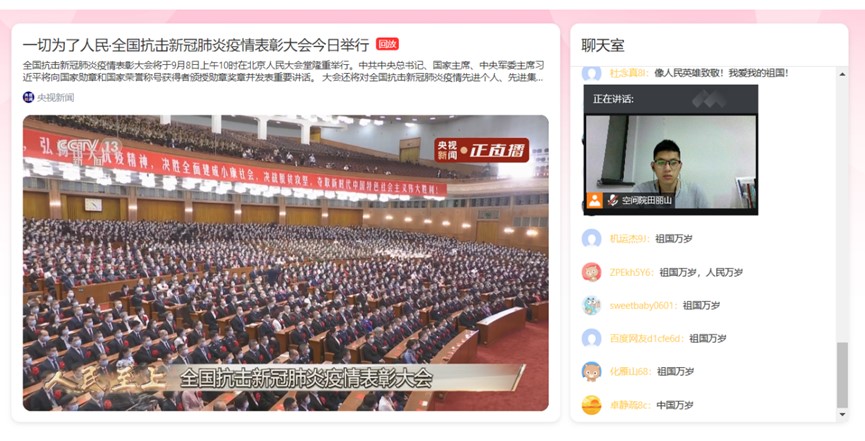 9月8日早上10点全国抗击新冠肺炎疫情表彰大会在北京人民大会堂隆重举行。中共中央总书记、国家主席、中央军委主席习近平向国家勋章和国家荣誉称号获得者颁授勋章奖章并发表重要讲话。2026世界杯指定网站组织研究生党支部就此学习习近平讲话精神并进行线上讨论。