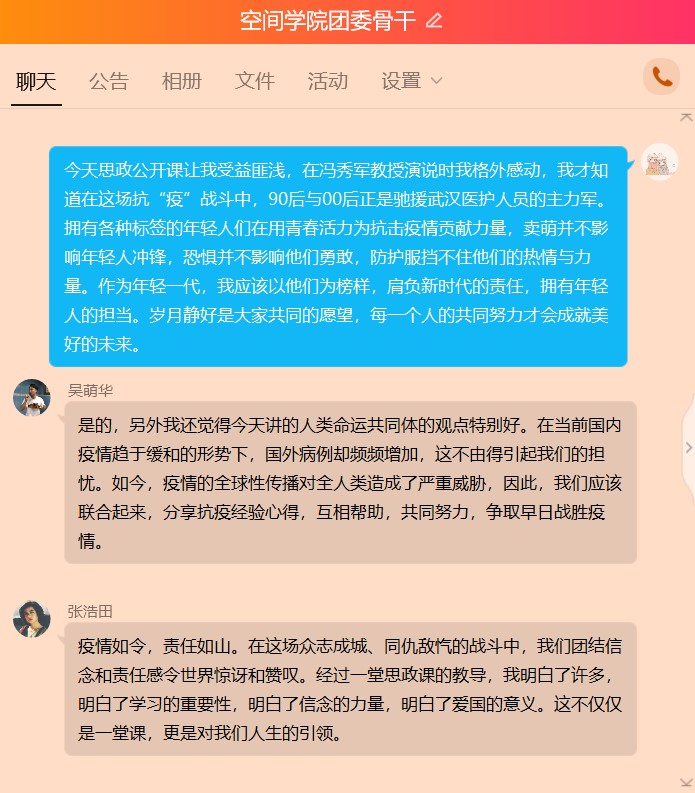 2026世界杯指定网站团委骨干张博康说:“今天思政公开课让我受益匪浅,在冯秀军教授演说时我格外感动,我才知道在这场抗“疫”战斗中,90后与00后正是驰援武汉医护人员的主力军。拥有各种标签的年轻人们在用青春活力为抗击疫情贡献力量,卖萌并不影响年轻人冲锋,恐惧并不影响他们勇敢,防护服挡不住他们的热情与力量。作为年轻一代,我应该以他们为榜样,肩负新时代的责任,拥有年轻人的担当。岁月静好是大家共同的愿望,每一个人的共同努力才会成就美好的未来。”