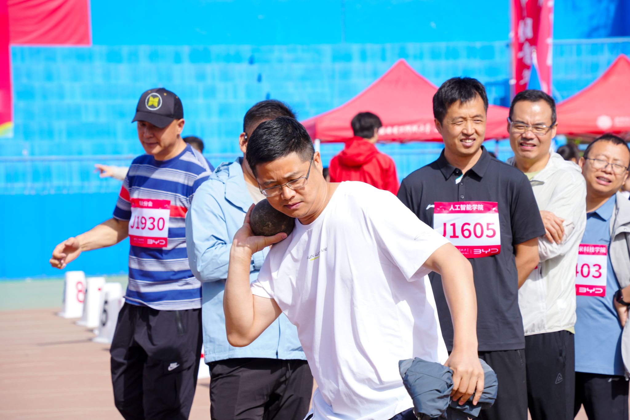 教工组奋勇争先,在男子教工男子中年甲组400米决赛中,随着发令枪响,贺王鹏老师犹如离弦之箭,率先冲出起跑线,取得了该项目的冠军。教工女子中年甲组100米的赛场上,沈方芳老师一路领先,以绝对优势冲过终点线,将冠军奖杯收入囊中。