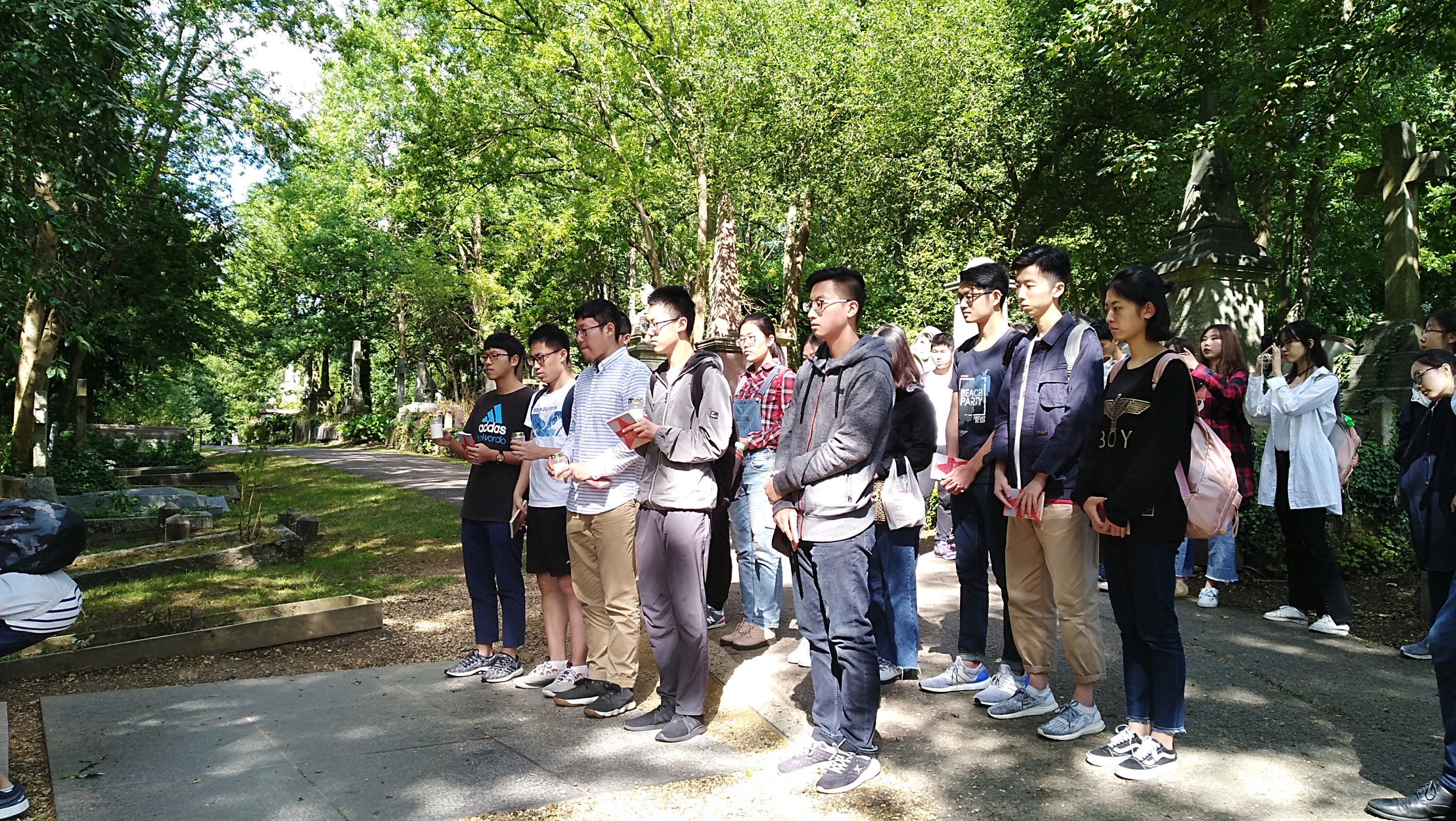 此次赴英访学,正值伟大的无产阶级领袖马克思诞辰200周年,为此,西电师生一行人特意来到马克思公墓拜谒。员工代表在墓前献上白蜡,师生集体低头默哀。大家在马克思墓前共同回顾共产党宣言的著名选段,集体重温入党誓词。在这位伟大无产阶级领袖的雕像前,西电师生深色庄重,誓言铮铮,展现了“三有西电人”良好的精神风貌和红色继承人的责任心。