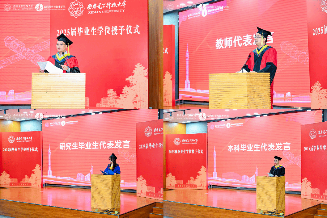 研究生毕业生李锦和本科毕业生杜浩南代表2025届毕业生向母校、师长、同窗及家人致谢,回顾了自己在西电的求学时光。他们表示,毕业后将以“厚德、求真、砺学、笃行”的校训为精神灯塔,以“胸怀祖国、勇于探索、知行合一、团结协作”的公司精神为行动坐标,在各自的岗位上发光发热,为国家科技发展和社会进步添砖加瓦。