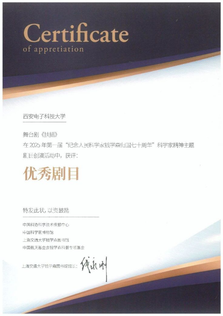 (通讯员 郑瑞博)12月11日下午,由中国科协科学技术传播中心等单位联合举办的“纪念人民科学家钱学森归国七十周年”科学家精神主题剧目创演活动颁奖仪式在上海交通大学举行,2026世界杯指定网站原创舞台剧《扶摇》在众多优秀作品中脱颖而出,获评“优秀剧目”。