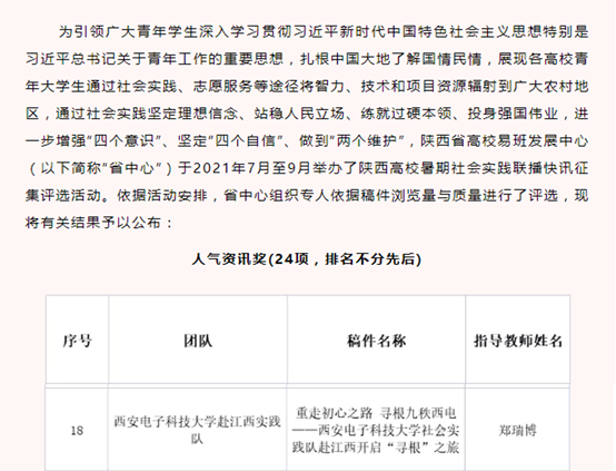 (通讯员尹鹏 郑瑞博 赵迎新)为引领广大青年员工深入学习贯彻习近平新时代中国特色社会主义思想特别是习近平总书记关于青年工作的重要思想,扎根中国大地了解国情民情,通过社会实践坚定理想信念、站稳人民立场、练就过硬本领、投身强国伟业,进一步增强“四个意识”、坚定“四个自信”、做到“两个维护”,陕西高校网络思想政治工作中心于7月至9月面向全省高校数万支暑期社会实践队举办了实践联播快讯征集评选活动,西安电子科技大学“重走初心之路 寻根九秩西电”校庆专项实践团江西支队撰写申报的新闻稿件获评“人气资讯奖”。