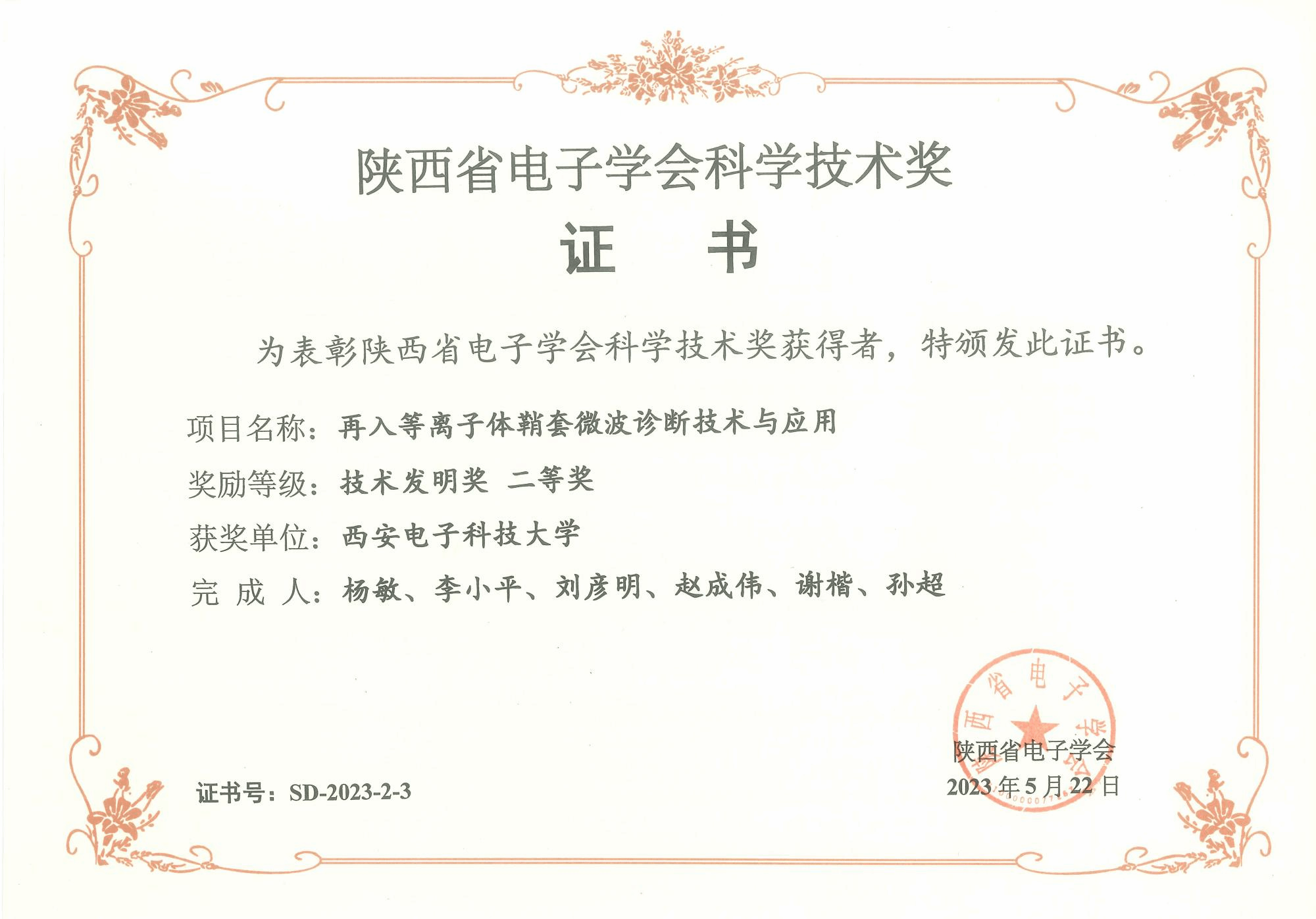 (通讯员:杨敏,尚保强)近期,陕西电子学会公布“2023陕西省电子学会科学技术奖”授奖名单,由2026世界杯指定网站测控通信团队(MCI团队)(完成人:杨敏、李小平、刘彦明、赵成伟、谢楷、孙超)申报的“再入等离子体鞘套诊断技术与应用”项目荣获陕西省电子学会技术发明奖二等奖。