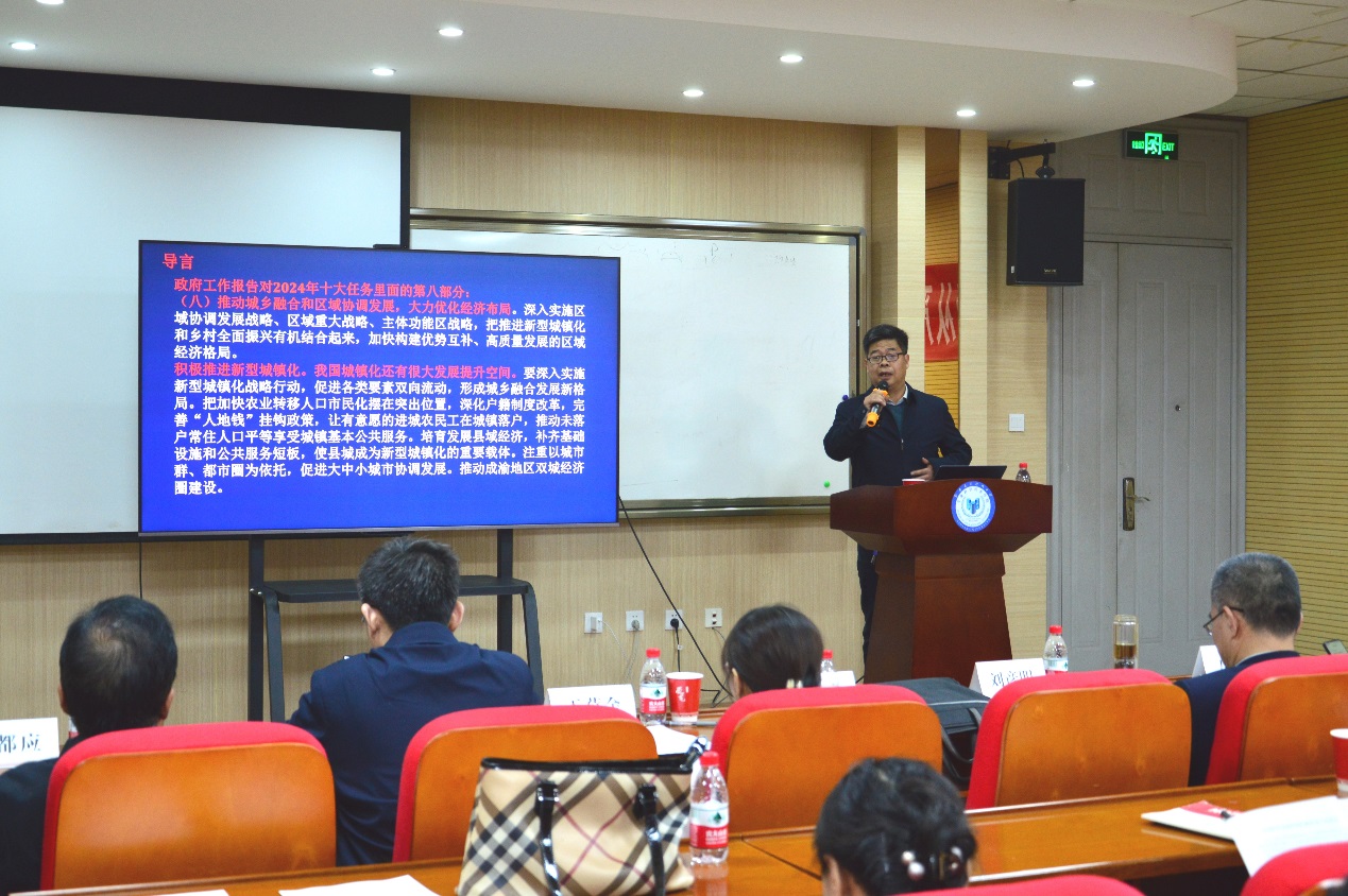 曹飞围绕“科技助力乡村振兴”进行两会精神宣讲,他指出,两会政府工作报告要求深入实施区域协调发展战略、区域重大战略、主体功能区战略,把推进新型城镇化和乡村全面振兴有机结合起来,加快构建优势互补、高质量发展的区域经济格局。他以陕西省相关县域发展特色为出发点,指出高校教师具有广博的知识面、丰富的科研经验、较高的科研能力,应在陕西县域城镇化高质量发展中扛起责任、挑起担子,紧抓乡村振兴机遇,充分挖潜着力点,找准切入口,注重以自身科研项目、科研成果以及科研能力为乡村振兴赋能增效,服务好经济社会发展。
