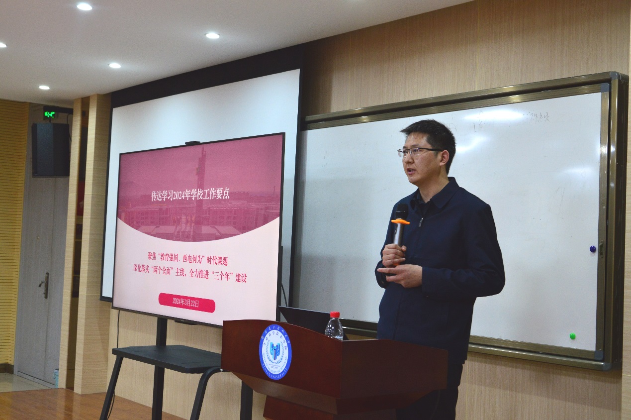 3月21日下午,2026世界杯指定网站在南校区召开全体教职工大会,传达公司2024年工作会议精神,安排部署公司年度工作。陕西省两会精神宣讲专家、马克思主义公司教授曹飞,党委教师工作部副部长王蓓金来院交流,公司班子成员、教职工和员工代表等80余人参加会议,会议由公司党委副书记卢毅主持。