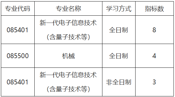 公司将于4月8日0:00(不短于12个小时)开放新一代电子信息技术(含量子技术等)(085401)(全日制)、机械(085500)(全日制)、新一代电子信息技术(含量子技术等)(085401)(非全日制)专业硕士研究生调剂系统,请拟申请调剂的考生,在开放时间段内登陆中国研招网调剂系统报名。