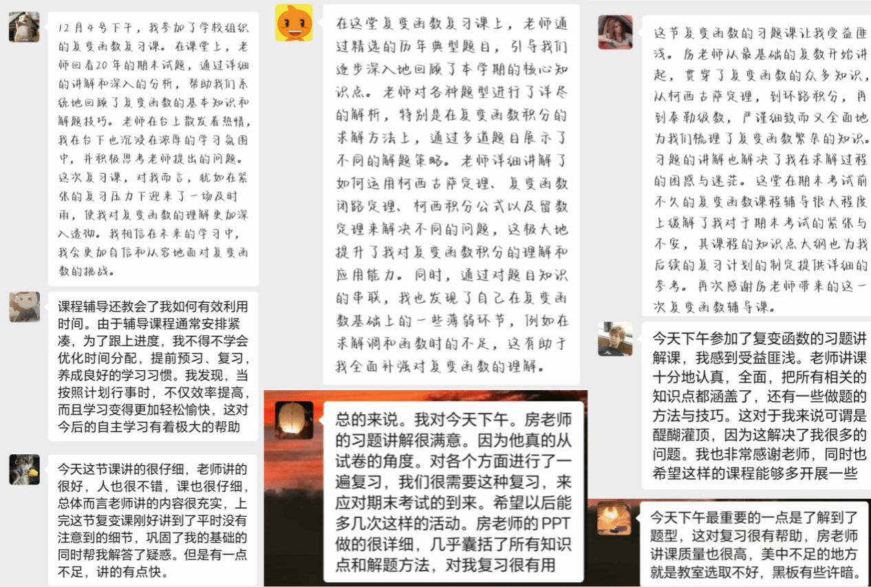 参加活动的同学们表示受益匪浅。一位同学谈道:“这节复变函数的习题课让我受益匪浅。房老师从最基础的复数开始讲起,贯穿了复变函数的众多知识,从柯西古萨定理,到环路积分,再到泰勒级数,严谨细致而又全面地为我们梳理了复变函数繁杂的知识,习题的讲解也解决了我在求解过程的困惑与迷茫。这堂在期末考试前不久的复变函数课程辅导很大程度上缓解了我对于期末考试的紧张与不安,其课程的知识点大纲也为我后续的复习计划的制定提供详细的参考。再次感谢房老师带来的这次复变函数辅导课。”另一位同学分享道:“总的来说。我对今天下午房老师的习题讲解很满意。因为他真的从试卷的角度对各个方面进行了一遍复习,我们很需要这种复习,来应对期末考试的到来。希望以后能多几次这样的活动。房老师的PPT做的很详细,几乎囊括了所有知识点和解题方法,对我复习很有用。”
